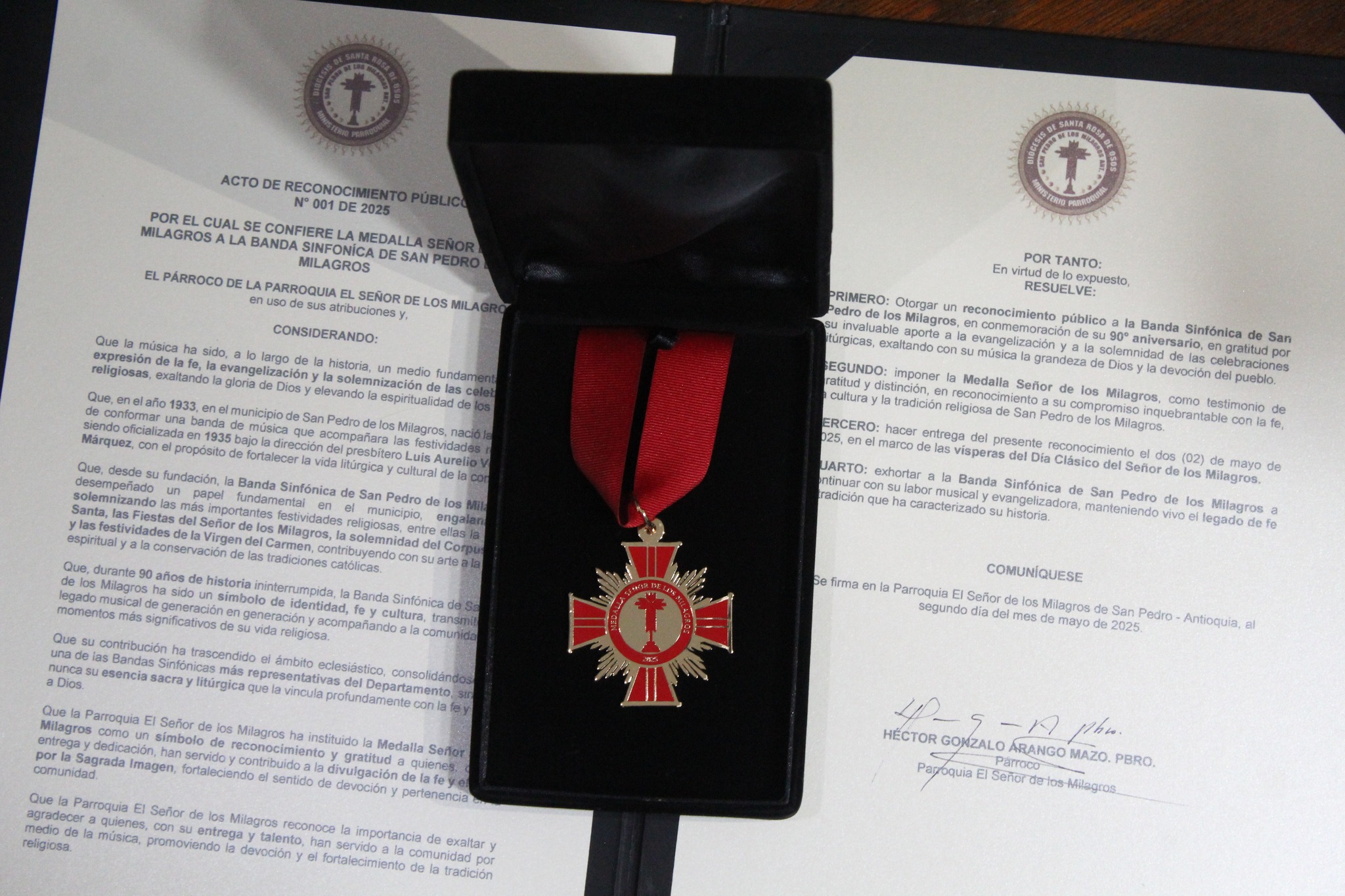Durante la ceremonia, el párroco Héctor Gonzalo Arango Mazo destacó que la música ha sido, desde siempre, un medio poderoso de alabanza a Dios y de crecimiento espiritual para la comunidad. “La Banda Sinfónica ha elevado la fe de los fieles y se ha convertido en un símbolo de identidad para nuestra parroquia y para San Pedro”, expresó el sacerdote al momento de imponer la medalla.